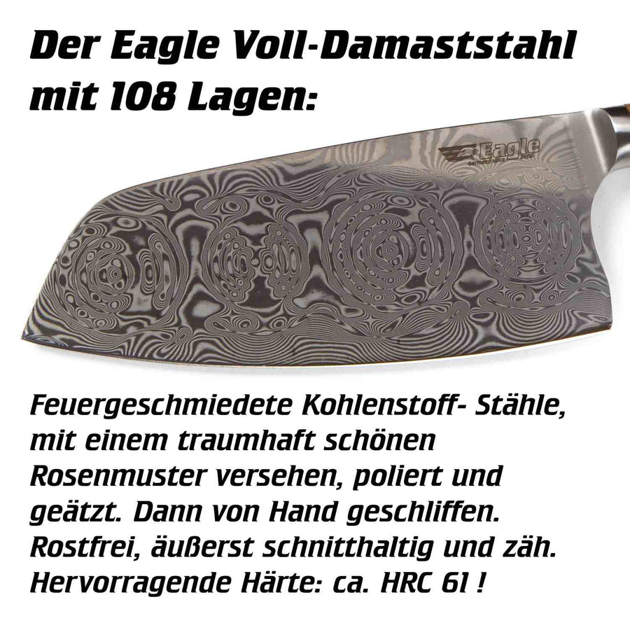 EINE KLINGE ZUM VERLIEBEN: Echter Voll-Damaststahl mit 108 Lagen. Verschiedene Kohlenstoff Stähle werden feuergeschmiedet und mit einem traumhaft schönen Rosenmuster versehen. Oberfläche poliert. Rostfrei, äußerst schnitthaltig und zäh. Hervorragende Härte: HRC ~ 61